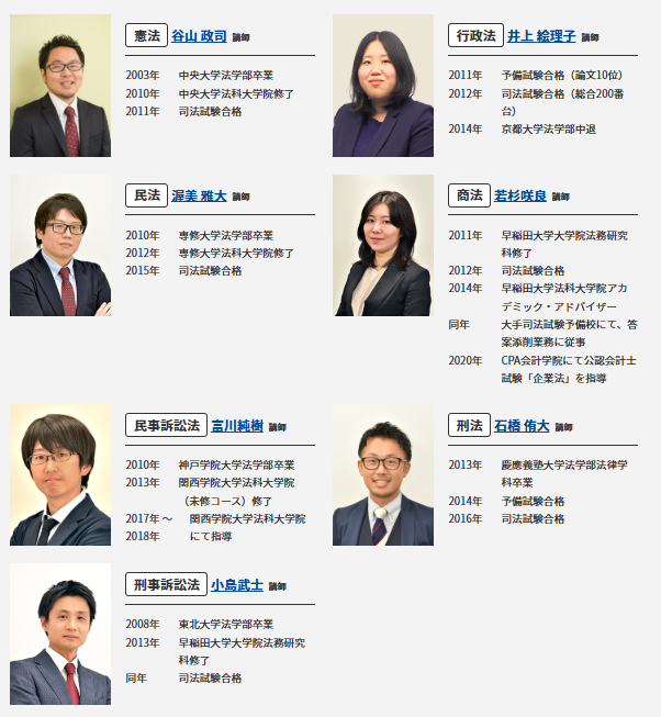 アガルートの司法試験・予備試験講座は、1科目1講師の体制を整えています。各講師が専門分野を担当するため、講義のクオリティーが極めて高いです。
